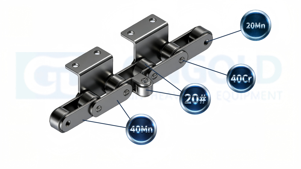 這款鏈條的銷(xiāo)軸采用40Cr作為材質(zhì),內(nèi)外鏈板則均采用40Mn作為材質(zhì),單論鏈條的強(qiáng)度,它的最小抗拉強(qiáng)度就能到達(dá)55.6kN。