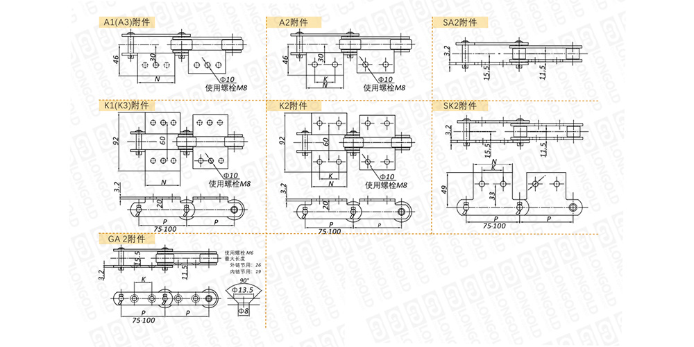 附件是為了將夾具安裝在鏈條上的零部件。可根據(jù)客戶要求設(shè)定安裝間隔。