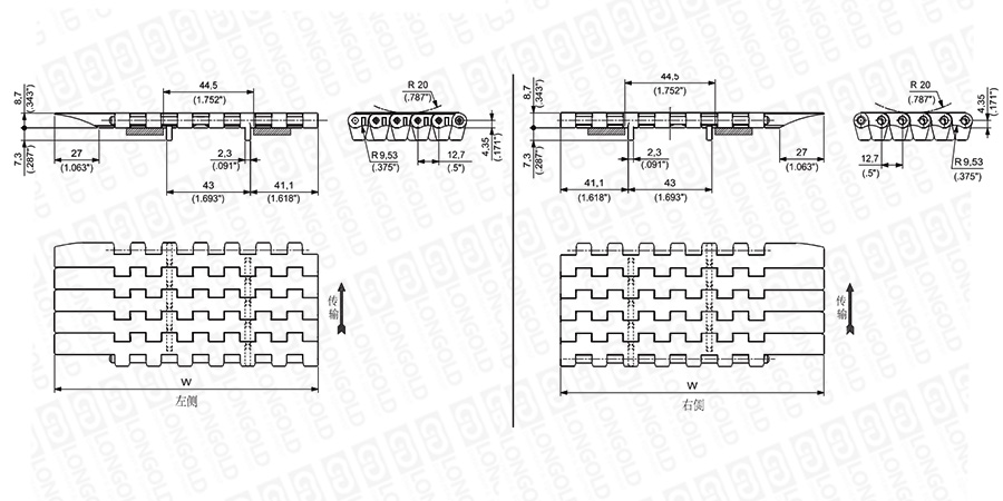上圖為1/2"節(jié)距鏈板 300G ATM系列,圖紙中已標(biāo)明部分尺寸。