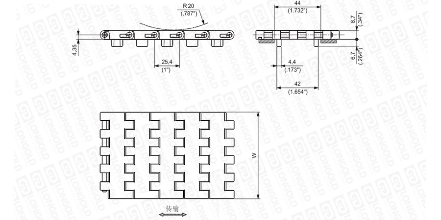 封閉與開孔式網帶可在輸送線上與磁性或勾腳型轉彎鏈板783或782系列并排使用,保證產品在直行與轉彎輸送間的順暢過渡。