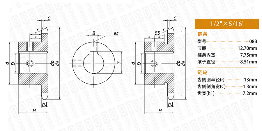 成品孔鏈輪,安裝(聯(lián)結(jié))后無背隙,由于采用軸向固定,不需要“防止脫落具”,定位準(zhǔn)確,鏈輪孔已經(jīng)加工完成,可直接安裝使用,配用LD08B-1單排鏈條。