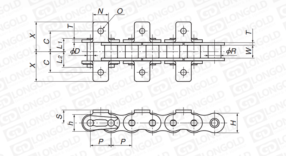 鏈條帶K1附件,即鏈條兩側(cè)帶折彎板,折彎板上各帶一個孔。