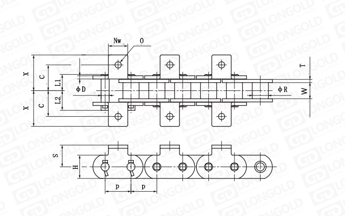 鏈條本體為雙倍節(jié)距鏈條,因此更適合用于對(duì)鏈條工作要求更加嚴(yán)苛的場(chǎng)合,同時(shí)鏈條帶K1附件,用以安裝特定部件來滿足工作條件。