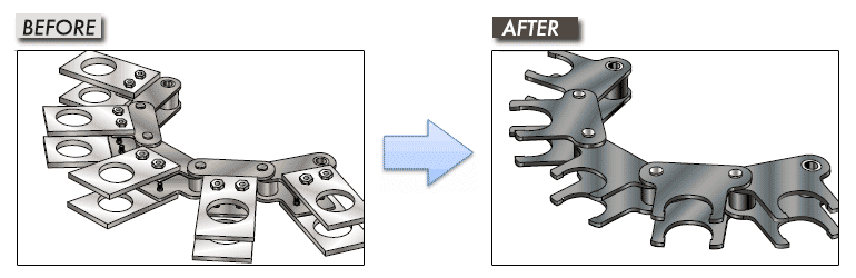 對將鏈條和工具螺桿固定住規(guī)格,我們提供將附件裝配后的整體鏈條。 將不穩(wěn)定的單側(cè)附件輸送變更成兩側(cè)附件輸送,實現(xiàn)了穩(wěn)定輸送。